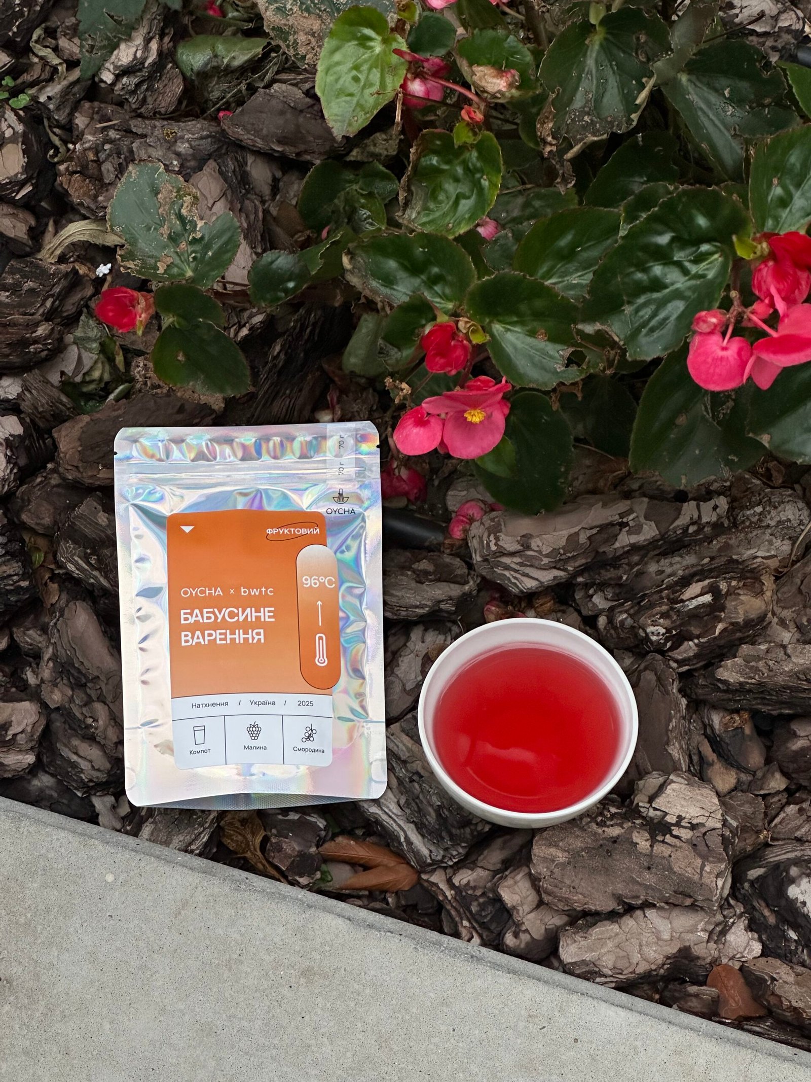 Купаж від OYCHA має приємну кислинку завдяки каркаде та яскравий післясмак, схожий на компот, але з незвичними для бабусі інгредієнтами. Окрім традиційних яблука і горобини, до складу входять ананас і папайя, які додають солодкавих тропічних ноток.