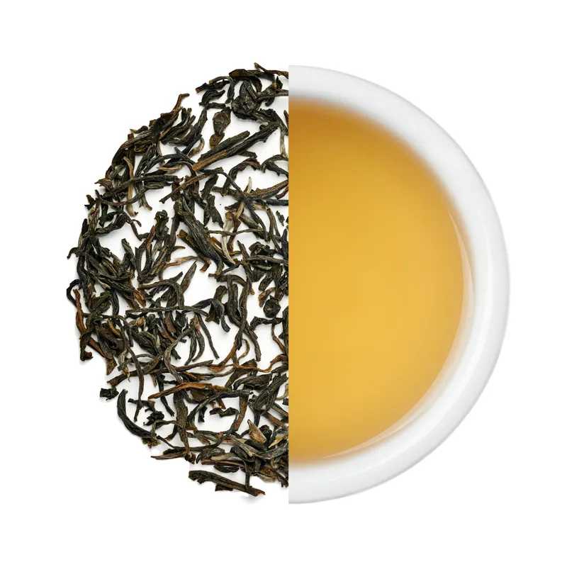 Скручені листочки глибокого зеленого кольору дають легкий, світло-зелений настій з виразними нотами трав і квітів. Стійкий, але ненав’язливий післясмак.